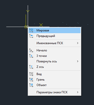 Для этого наведитесь на значок системы координат, нажмите на него правой кнопкой мыши и выберете "Мировая".