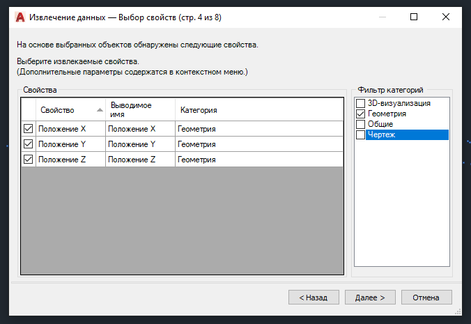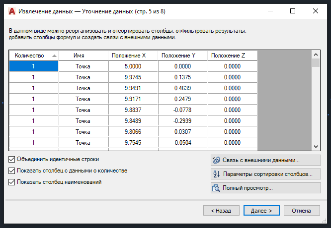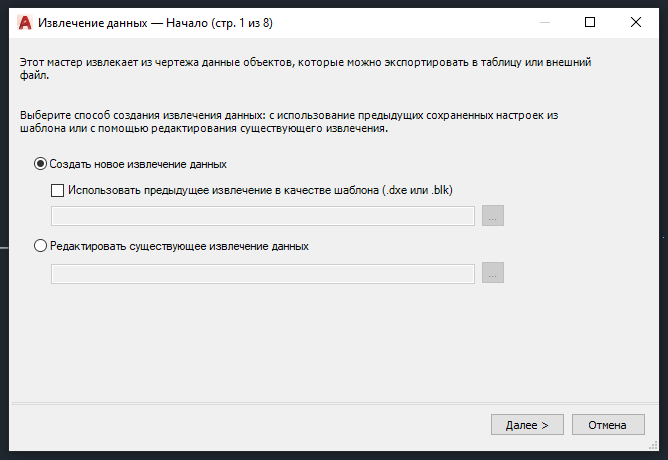 С помощью команды "DATAEXTRACTION" откроется окно извлечения данных. Выберете "Создать новое извлечение данных". Нажмите "Далее".
