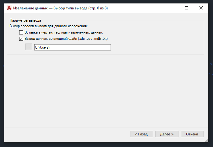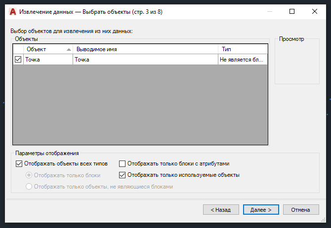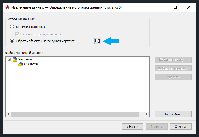 Ставим галочку "Выбрать объекты на текущем чертеже" и нажимаем кнопку рядом. Окно извлечения данных скроется автоматически для выбора объектов с чертежа.