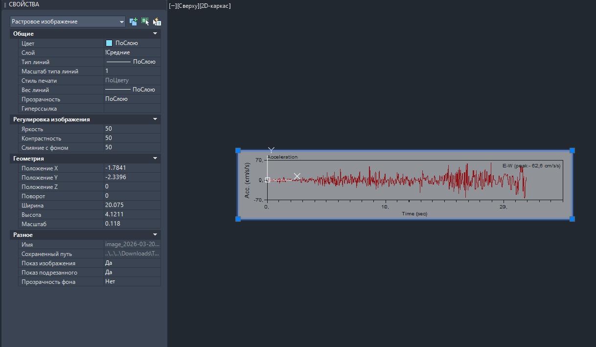 Переместите картинку таким образом, чтобы координаты точки (0,0) на графике соответствовали началу координат в AutoCAD. При необходимости отмасштабируйте картинку таким образом, чтобы длина отрезка на оси графика была равна соответствующему отрезку в AutoCAD. Масштабировать изображенние можно через панель "СВОЙСТВА" с помощью параметров "Ширина" и "Высота".